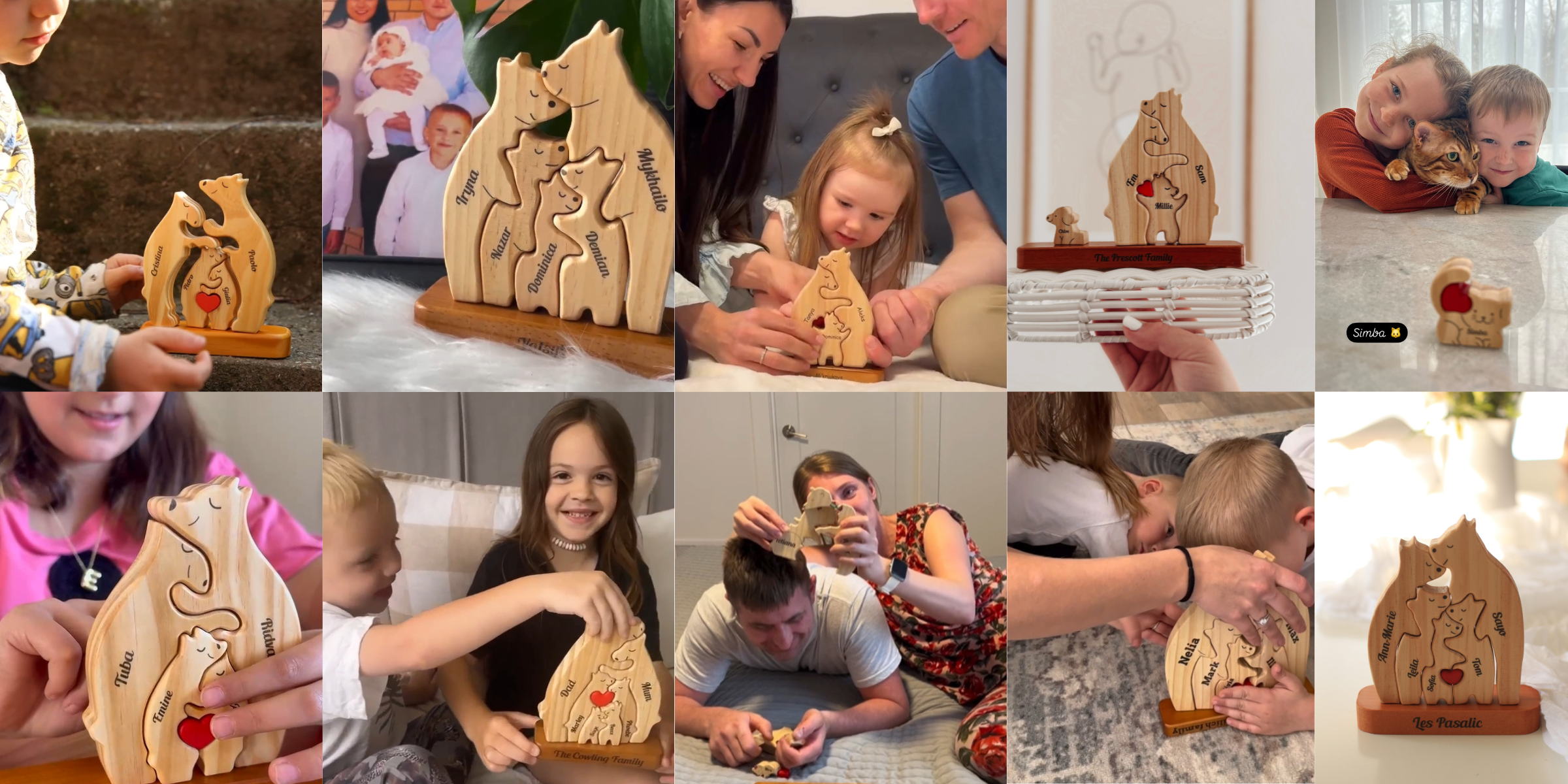 Personalisierte Holzbärenfamilie mit Herzen - Puzzle Holzbärenfamilie - Holzschnitzereien für Haustiere