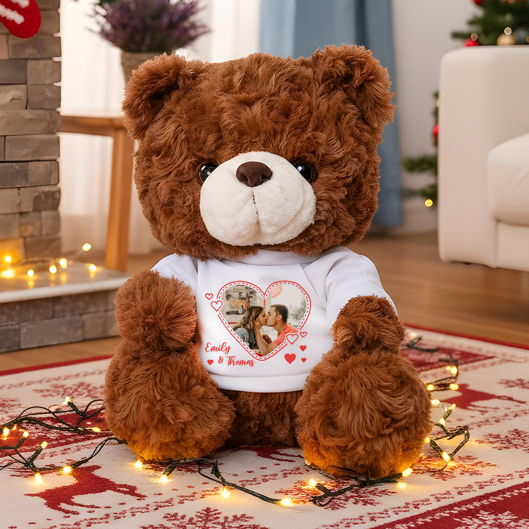 This heartfelt bear, with its photo-customized cotton tee, symbolizes eternal love. Soft and huggable, it comforts all ages as a cherished keepsake, tenderly preserving precious memories of your love story.
